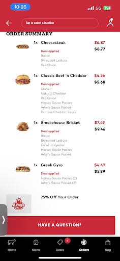 fast food scale: 8.5 / 10, use app, amazing deals there, very filling. service: 10 / 10, ladies there have good smiles interior: surprisingly nice, 10 / 10 would come back for cheesesteak. would maybe come back for gyro if you just want your fix and don't want to buy an entire gyro set from supermarket. arbys sauce is bad. horsey sauce is acquired taste, but good! very bready, but on bright side this makes their sandwiches easy to cut in half at home and very filling if you are hungry and want to spend less than $10. lots of animal protein...