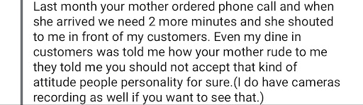If you need me to get a warrant now, I have absolutely no problem with that. And on top of that I will be reporting your business to the Better Business Bureau, Cumberland County Health Department and NC Attorney General – Consumer Protection Division. So if they do a surprise visit to your business I called them. I will not rest until...