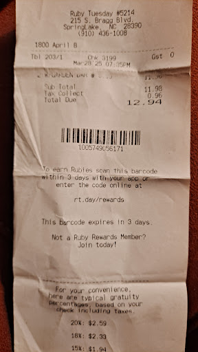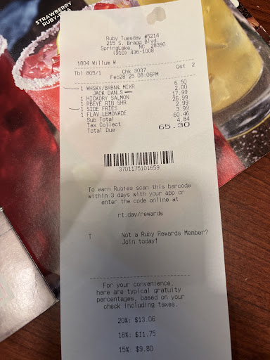 Read moreMy husband and I have always loved Ruby Tuesdays.We were very sad when a lot of the locations closed. And then on March 28th, we were excited to find that we were close to a Ruby Tuesdays that was open, and since we've been traveling all day, we needed a place to stop for dinner, so naturally we chose the Ruby Tuesdays. It took quite a bit of time to get a server. But we felt like perhaps they were shorthanded. My husband ordered a glass of white wine, and I ordered a glass of sparkling wine, which was prominently advertised on the menu. But after 10 minutes, neither the drinks nor the waitress appeared. I went in search of her and found her standing at the bar. I asked about our drinka and she said she was working on it. A few minutes later, my husband's wine came, but it was room temperature. Instead of sparkling wine, I was brought a glass of red wine. I informed the waitress that I had not ordered red wine but sparkling wine. She said that was the only wine they had by that brand. She did not seem to understand the difference, so she took the red one back and said she'd check it out. We waited another 10 minutes, and then my husband took his hot wine to the bar to ask about the problems with the drinks. The woman at the bar told him that they didn't have enough room in the cooler for wine to keep it cold and that they've never had any sparkling wine despite the fact that it was on the menu. Then she asked him if he'd like some ice for his wine. The waitress still had not returned, so I went once again to find her. I found her in another section of the restaurant. I asked her to come to our table. When she did, I asked to speak to the manager. Shortly thereafter, a young woman came to our table, who was extremely curt and said she was the manager. We explained what had transpired. She asked, "So, what do you want?" We had ordered some entrees with the salad bar as a side.But considering what was going on we were not comfortable with the idea of food at this restaurant so we told the her to cancel our order and we would just pay for the side salad. She Informed us that if we didn't have an entree, we would not receive the side salad charge, and we would be charged full price for 2 small plates of salad. After we objected, she said she'd get our bill. We asked if she intended to charge us for two full salad bars. And she said no, so we asked what she was going to charge, and she refused to tell us and went to get the waitress to bring us our ticket. In all fairness, she only charged us the side salad price for the two. I don't think I've ever given a one-star review. I can always find something positive to say about any less than great experience.but there wasn't any place else to go with this. I'm truly sorry. We were deeply disappointed because we loved Ruby Tuesdays. But I don't know that we'll ever go back if we...