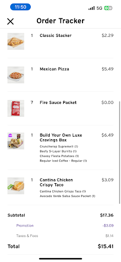 Overall, if you need sauces to power through the food, that food is not that good. Halfway through my meal I was just wondering "what am I even eating" and didn't finish a lot of it because I'm trying to mitigate my stomach having to process all this. If you taste the beef by itself it tastes vegan. If you taste the chicken by itself it tastes vegan. If your tacos taste better just because you're being carried by a Doritos shell, that's not Taco Bell food being good, that's the public's love of Doritos carrying your below-average food quality. I'm not knocking people that come here for their favorite sodas or non-protein sides, but Taco Bell's protein options are lacking. This is not the workers' faults. I would take a chicken or burger spot, or even a Panera salad over TB any day at this price point, but it was good having a lot of TB today to teach myself I will never come back here again. With the app you CAN get a good amount of food though, so if you are starving and just need something edible by humans to get you through the day, come here for your energy sources and cautiously put these items...