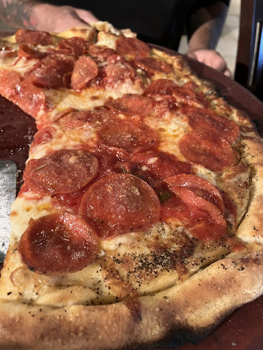 The pizza we ordered was the Paul & Young Ron with the choice of hot or sweet peppers. We chose the hot pepper option, and the pizza was topped with WHOLE green chilies that had not been sliced, and the seeds and pith (squishy insides) had not been removed. This is an absolutely unacceptable way to serve green chilies and the concept is neither "unique" nor appetizing. Biting into the peppers fills your mouth with seeds and pepper guts that you immediately want to spit out.