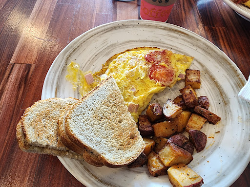 Clean look with not a lot of seating in what I could see, with some high tables in the front. Ordering is walking to the counter and taking a look at the menu on the counter. Young lady in charge of the register was friendly and helpful. Everyone seemed in a good mood who was working so atmosphere was very inviting. I had the western omelet which was very cheesy (that's a good thing as I love cheese) and done well. The potatoes with it were spiced nicely but not uniformly done. Some crunchy some very soft, but they tasted good. I also tried the French toast that was done well and tasted good with fruits and powdered sugar on top. Clearly coffee was an important part of this meal and although they were out of my original order I was recommended the mint latte and it was mildly sweet with the right amount of flavor. The iced caramel was also good that I was able to try. The setting is both child friendly and the staff is good at making you feel at home. Recommended for a decent breakfast or brunch, and a nice place to sit and talk over a...