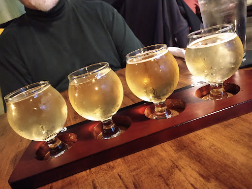 Our server gave us menus and took our drink orders. We opted for the flight of four ciders of our choosing. Hubby, who's no longer much of a drinker, chose ciders on the sweeter side. I like adventure and picked out two of the spicier ones, although one was one I had previously had at another pub and knew I'd be wanting to have it again (Ginger Geri - sooo good! Love that burn!).