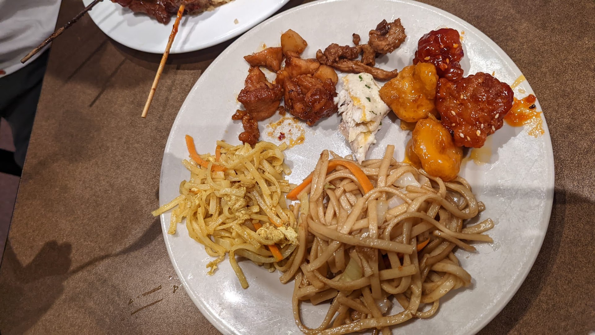 The grilled pork sticks were very tasty, tender and easy to eat. Egg rolls were quite good as were the lo mein noodles. Some of the fried shrimp were hard, not crisp. Cold boiled shrimp had no perceivable seasoning so you need sauce. There are a wide variety of sauces.