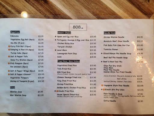 The Wonton soup wasn’t what we had had before. Different ingredients and not fresh some over cooked seafood and rubbery. One time we get loads pot stickers next time a few odd wontons. One time perfect veggies and beautiful freshness next time it was awful. I also ordered pork egg rolls and on one of my bites I could taste “fishy” flavor. It was odd to taste that in a meat egg roll. If I had had a shellfish allergy it could have been a disaster. I don’t know what kind of fish was in the meat roll but it did NOT belong. Also there was less veggies on both the pork and chicken dishes. It really disappointed us. We spent almost $80 on dinner. The 1st few times we ate there it was good/decent. We only assume different cooks in the kitchen? The owner got extremely angry over us returning the Wonton soup. When I eat an item somewhere I expect it to be the same quality every time. We would have been customers for life. The owner reacted in a very unprofessional manner (angry). Also, we had no idea this was an Asian restaurant but just happened by it one day. No menu in window. We really really wanted to believe this was a great place when we discovered it and was willing to spend $$ there frequently. After that incident they lost a huge sale every month. 808 cafe doesn’t explain what kind of place this is. The name says “cafe” NOT asian food. Although they have a great variety this incident sold us to NOT be frequent flyers of...