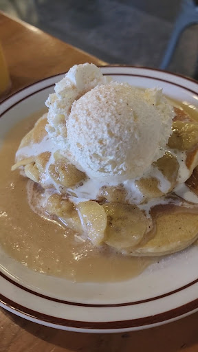 Man I'm really conflicted, I dont want to be harsh but there was a few issues. The place was hard to see from the road as it's covered by some architecture so we did the run around and it was on the side of the building. This is not really a con just some information. When we got in it was just starting to pick up and in time it got really busy. Our server was the only person serving for some time so it took a while to get both the order taken, and actually getting our food. They seemed quite understaffed. That translated to the server being what I felt was short when taking the order, so much so he talked over me when I asked to get the hash browns extra crispy. This leads to the food. We got the bacon, eggs and hash. The bacon and eggs were great but the hashrowns were awful, like literally only cooked on the top side. No salt, no flavor and undercooked. Maybe it was the rush to get the food out with the full restaurant. That aside my water was empty almost my entire sit down sadly but I get it as a few guys showed up later to help and I finally got my refill as I was getting ready to pay. I will say we got the banana foster and the banana cream pie pancakes and they were absolutely phenomenal. This is my conflict as the service seemed rushy, cold and short but the food was overall good. I know it's just short staffing as it seems they have been getting more popular so I wouldn't let my singular experience turn you away, I just hope they do better for...