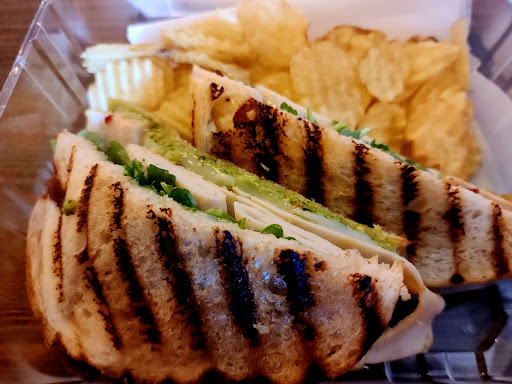 I live nearby and wanted to try a local place to eat for lunch. This Cafe is located at the corner of Jones and Russell in a small mini-mall next to a Wing Stop. It has a very homey, cozy vibe interior with industrial type edison bulb lighting, rustic Midwest vintage decor with a splash of Star Wars memorabilia (the owner loves Star Wars), comfortable seating on weathered couches or tables and chairs, and a chalkboard menu. The menu leans heavily on teas, coffees, shakes, and hot and cold lattes. In addition there is a selection of sandwich options and fresh baked treats available. You order at the counter, pay, and wait for your name to be called. I ordered the Turkey Pesto sandwich. It comes with potato chips and served in a clear square to-go container. It was $11.50. Given that it's a local place and the price level of restaurant food, this was about what I expected but was expecting it to be served on a plate rather than a to-go container with a side of more than store-bought Ruffles potato chips (my only slight criticisms). The warm, toasted sandwich was what I had hoped. A tasty blend of pesto, fresh greens, sun-dried tomatoes, and turkey breast on delicious panini-pressed toasted hearty fresh bread. It was a healthy portion and tasted delicious. I didn't try any of their drinks or baked goods, but I will on future visits (of which there will be.) I really enjoyed my sandwich far better than any chain options available within the area. Also the service was cheerful, friendly, and helpful. I definitely think it's worth giving this cute, cozy neighborhood ...