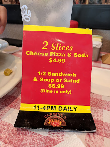 Ā Ā Ā Read moreI don't understand why all the great reviews. I went here tonight and ordered a salad, pizza, wine and dessert. The "Carmine's Chopped Salad" was finely chopped lettuce, tomato, mozzarella and ham. Nothing special. The salad was decent and the blue cheese dressing was good but definitely not worth $10. The "Carmine's Special" pizza was sparsely topped and the crust was perfectly cooked. However, it had almost no flavor. The crust lacked the yeasty flavor of a handmade dough. The Italian sausage was tasteless and the pizza sauce was bland at best. The cheese was also flavorless. I ordered the house Cabernet, which tasted like box wine and at $7.50 for a small glass, it was way overpriced. BTW, don't drink the water. It was worse than my own tap water. To finish the meal, I ordered Zeppole, which I expected to be fluffy little fried donuts with chocolate and raspberry sauce, whipped cream and ice cream. What I received was chewy, fried pizza dough with stale ice cream. The last thing I needed was more pizza dough! The one great thing about Carmines's was Megan, our server. She was very nice. This was our first...