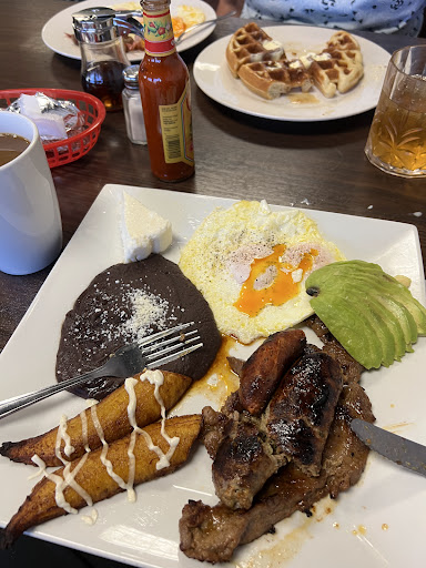 . I ordered the variety plate. Two types of Central American sausages and a marinated grilled steak. Along with two rags, black beans, and plantains. I got a side of avocado as well. My Mexican style coffee was smoother and rich. The household management ordered waffles with eggs and bacon. The eggs were defiantly free range. We don’t really care but the flavor was excellent.