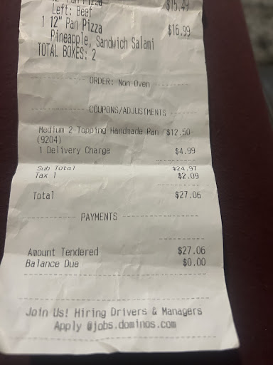 Read moreVery bad experience, with this store . I ordered wings and lava cake with 2 packs of ranch and 1 icing. I opened both boxes no ranch no icing. I ask why they missing, Girl said ,,o sorry it's other guy,he forget. Since I live half mile from DOMINO'S, she said I will bring the ranch and Icing, I said ok. 15 minutes pass ,wings are cold,lava cake is cold. I am getting in my car ,she Is coming down the street. I said why is it that you coming back 15 minutes later,when is only less than 5 minutes ,I live one block from Domino's, only reason I didn't go by myself Is because I have little kid,,,You know 15 minutes waiting for ranch and icing, this food is cold I said to her ,She give me FUK OFF FACE, like it's my fault. My point is,, its fricking right on the corner, 1/2 mile from my house. They made mistake, not me, and everyone knows that when hot wings are cold, it's done. And lava cake same thing. Also this is not the first time that I have issues with this people. So rude and unprofessional. And I tipped that girl. 8 wings and lava cake with extra ranch and icing $17 dollars. And food is frickin...