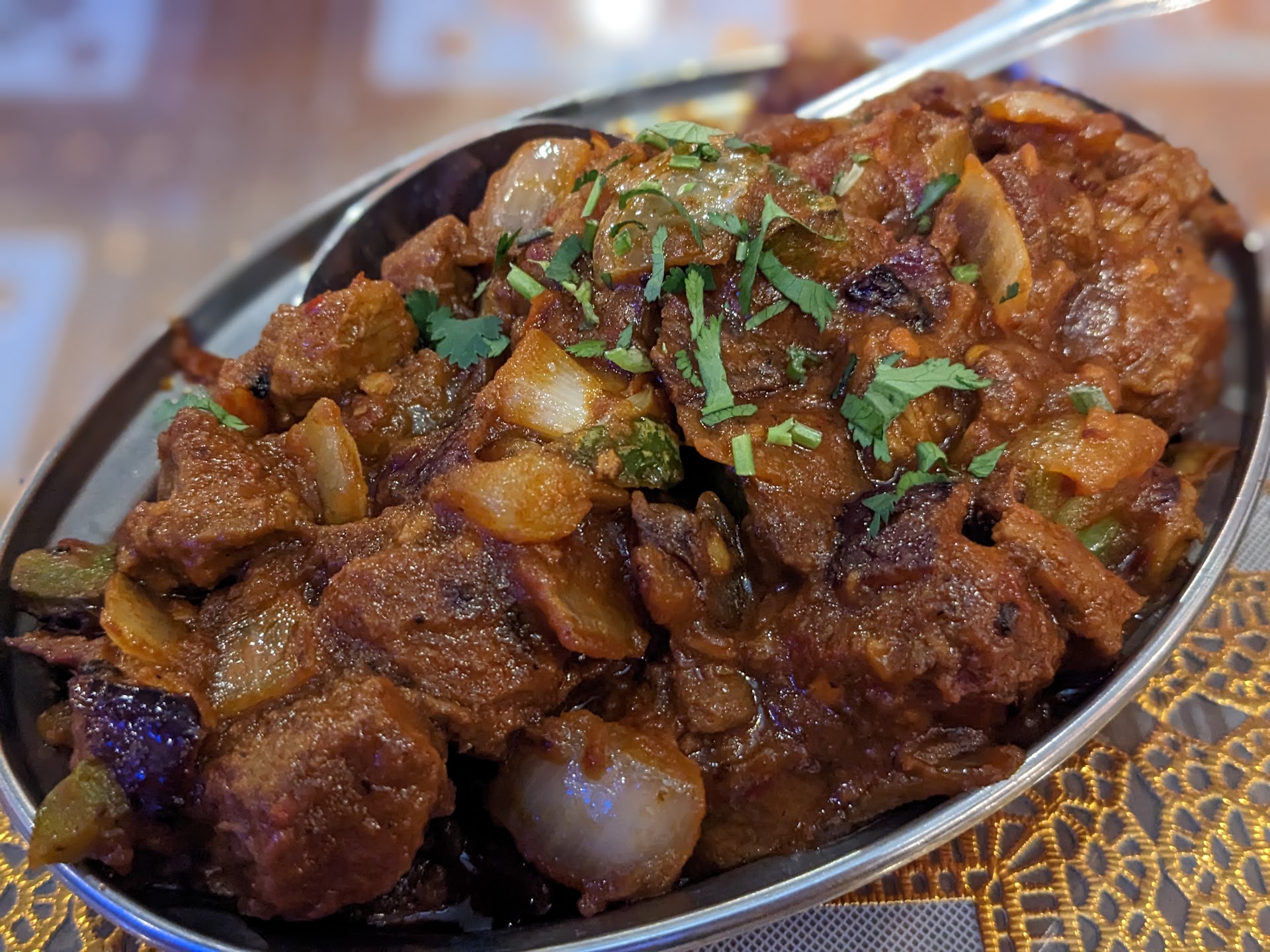 Speaking of the food, we received the traditional Papadum after we sat down; we ordered the Kingfisher Beer and a glass of Cabernet Sauvignon for our drinks; Vegetarian Appetizer Platter and Lamb Samosa for our appetizers; and Lamb Chili, Lamb Mint Curry, Butter Naan, and Spicy Chili Garlic Naan for our main entrées. This restaurant served the most Papadum of all the Indian restaurants I have experienced in this city...which was and is always appreciated because I always seem to arrive at Indian restaurants starving, like I didn't eat for days. All the food we ordered was very flavorful and had a nice texture to the ingredients, especially the lamb. I was slightly puzzled with the amount of food they served because it felt that the dishes were a little smaller than other restaurants I've been to. But don't quote me on that. It could also be the fact that I was starving, or perhaps because it's been a month or so since I've visited an Indian restaurant. Also, the Naan was good, but I felt it had a little too much butter on both of them and the Spicy Chili Garlic Naan wasn't as spicy as I hoped for.