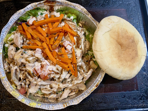 It came on a bed of seasoned long grained basmati rice, Mediterranean salad, and I added some carrots, tomatoes, and sauces. I got the Tahini and Red Chili Harissa sauces. I sometimes go to two other Mediterranean places and their sauces are better , but I have to say the chicken was very tasty here and they gave me a very good amount of it. They weren't stingy with it like some places are. The salad and vegetables were fresh and crisp. The pita was very light and tasty. There was a line when I came in but it moved pretty quickly. I would...