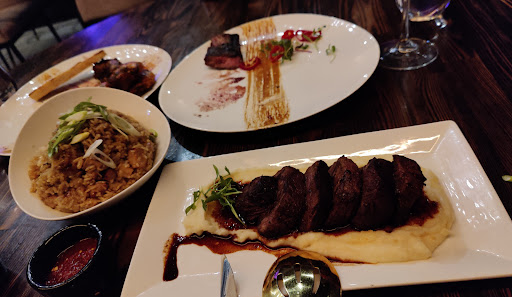 Read more1st time here. 1st impression: WOW! The decor is amazing! You enter through brown wooden double doors and walk past the host and see this gorgeous lighting fixture made of probably thousands of white flowers hanging from the ceiling. The walls look like sound proofing material but it was concrete. In the center was a statue which seemed to float on a water feature which looks like an infinity pool. Super high ceilings. We were seated in a booth made of crushed red velvet. So posh. Beautiful ambiance.