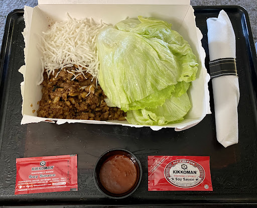 Read moreI have been by here a couple times and usually it seems to be about half full . Today I was at the Palm's briefly and decided to get the Chicken Lettuce Wraps to go . Just something quick to eat for lunch at home . They were $14 and it had a good amount of ground chicken with spices and mushrooms , about 6 lettuce leaves , some crunchy white noodles , and what was supposed to be peanut sauce , but was a hot sauce , and 2 packets of soy sauce and napkin with plastic spoon , fork , and knife .
