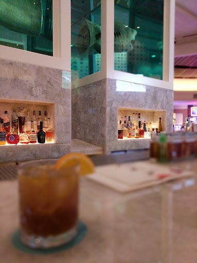 Read morePre-movie tank fill at The Palms. Nursed the $18 Buffalo Stampede until showtime. Though the liquid did not reach even the midway point of the Palms-branded cube, the cocktail was strong, and the spiced sugar lent a delicious contrast. Atmosphere: Lots of white marble, cream and gold, punctuated by the multicolored dipping dots on the walls. Centrally located in the casino, low walled, music from the floor. TVs were imbedded into the pillars, a good non-intrusive way to maintain the sleek lines of the bar. Then, of course, the eponymous segmented shark over the bottle display; shades of Hannibal. Service: Male bartender all business; lady bartender more particular...