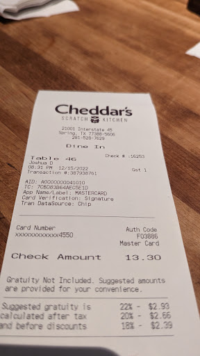 Ā Ā Ā Read moreWe really enjoyed our meal here! If you're looking for a family friendly, relaxed, mid-range priced classic diner meal, but you don't want to go to Chili's or Applebee's, Cheddars Scratch Kitchen is a great option! The food here is really good, prices are fair and the staff here is fantastic! We came here on a whim because I've driven by it numerous times, but, never actually ate here yet. Upon walking in we were immediately greeted and and seated very quickly. The restaurant dining area was very busy, which I always take as a great sign that the food & service will not disappoint. CSK offers a wonderful selection of favorite American and Southern plate classics. The waiter arrived quickly and had a very pleasant attitude. He took our drink orders and quickly also brought out a complimentary plate of butter honey croissants. The croissants were buttery delicious and very indulgent. The menu offers a wide variety of foods and classic dishes that you find at this type of chain restaurant. We each had something different to try to get a sample of everything: *The Caesar salads were good but a little heavy on the dressing. *The chicken fried steak was well seasoned and not greasy (the steak was about the size of a man's large hand. *The ribs that were cooked well and dry. *The cheeseburger had a nice Smoky taste to it and also topped with fresh vegetables. *A steak with chicken tenders plate, which were both cooked correctly and not greasy. The dining area was kept clean, with tables ready for new guests. The restrooms are acceptable/not the greatest. And the overall staff does a wonderful job of doing their part to make sure that this restaurant runs well and efficiently I give cheddar scratch chicken 2 big thumbs up for the wonderful service, pricing and good classic meal selections. I would definitely recommend Cheddar's and will be...