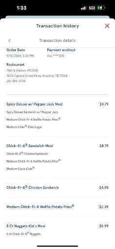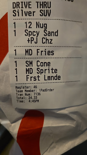 Read moreCame in for a late lunch and placed our order at the drive thru and the cashier taking our order was very dry, but not impolite. A few seconds after receiving our order, she just walks away from my vehicle with my card without saying anything. She then speaks to another employee and then comes back over and asks me to give the whole order. No problem I said and repeated the order. She gives my card back and I swipe to complete the transaction. I pull forward in the line and another employee comes up and asks for payment. I told her that I just paid with the previous person and I point over to where the first employee was so she could verify. Instead they go back to the window to discuss with someone else. Then, comes back a second time and says that I haven't paid. When I get to the window, I'm told again thay I didn't pay. I tell them that I did, just go talk to the FIRST PERSON. Now, I have to pull out my phone and show the transaction completed from my banking app. The cashier rolls her eyes and just hands the food over. Not one person in this entire line apologized for their error once. I'm not sure if this is what Chick Fil A counts as service, but clearly this is not what I expected. Won't be going back to that location ever again. Do...