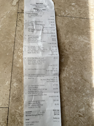 Read moreTERRIBLE service and mediocre food. When I entered, I was directed to seat myself and shortly thereafter a waitress brought me a menu. She returned quickly to bring a glass of water and take my order, grilled pork bahn mi, beef stew, and Vietnamese coffee with condensed milk. So far so good. I waited about 5 minutes for my sandwich which was smaller than I've had at other Vietnamese restaurants. Okay, not too bad because I also ordered the stew. It was okay, nothing special. I reminded her to bring the coffee. About 5 minutes later, another waiter brought my stew, but still no coffee. I asked him again to please bring it. By this time, I'd eaten my sandwich so started on the stew. This dish was VERY disappointing. I fished 3 huge chunks of pure fat out of the bowl before I even tasted it. 🤢 The few pieces of actual stew meat that were in the bowl were tender and tasty, but most of them were excessively fatty. The broth was overly salty and lacked flavor otherwise. I've eaten this before, at Hughie's, and their version is delicious with a balance of spices and no chunks of pure fat, so I am not a newbie to this dish. I only ate a few bites of Datpho's version. Finally, my waitress brought my coffee, already mixed and in a to go cup, which was a little weird but fine. The coffee was very good! Then, I waited for my check. And waited, and waited. I took my card out of my purse and put it on the table to indicate I was ready for my check. And waited some more. I kept trying to catch someone's eye, nothing! Eventually, the busboy came around clearing tables and I asked him if he could please tell my waitress to bring my check. He told me that I needed to pay at the bar/counter! What?!!?! I sat there for almost 15 minutes waiting! There was no indication anywhere that would have led me to expect I should pay at the counter other than being COMPLETELY deserted after I had received my food. I even told the waitress when I placed my order that I would probably need a to go container for the stew because I didn't think I'd be able to finish it and a sandwich, but as it turned out, I didn't want the leftovers anyway because it was not good. Regardless, I will never ever be back to this restaurant. I only went there in the first place because I was craving Vietnamese coffee and Bay Fusion is now closed except Thursday-Saturday for some strange reason. Anyway, next time I get a craving for Vietnamese, I'll wait until I can go to...