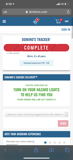 Read moreTonight we opted to pick up our two medium pizzas from the store with the option to have a Dominos associate bring the pizzas to our car and drop them off contactless. I had my 8 month old son with me, we arrived when our pizza tracker informed us it was time for pick-up. We followed the text instructions (we arrived at 8:03pm) put my hazards on and wait for an associate to bring the pizzas to the car. I sent a send text at 8:15 then proceed to try and call the store (no one answer). At 8:25pm, my 8 month old is now screaming, I put my mask on, unload my son and we go inside to pick up the pizza. An associate walks up, say “hello” not “how can I help you?” I explain that I have been waiting for our order in the car and had opted in for the deliver to car method, I tell her my name for the order. She then walks over to the station and picks up my pizzas (they were just sitting there ready) says nothing and hands them to me. I was agitated and I’m sure she could tell as But as I exited the store she then says “have a good night”....