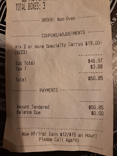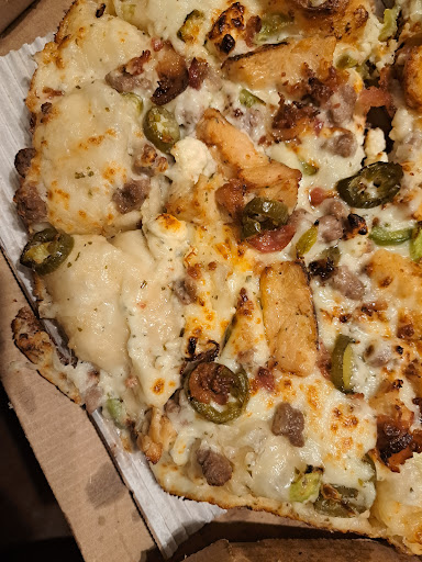 The box of one of our pizzas was MASHED in from the long, skinny box on top and half the pizza had BARELY any toppings, although we asked AND PAID for EXTRA!! Even WORSE, was that the pizza was still DOUGH in the middle and even the "bare-minimum cooking time" must have been rushed because the crust was only MINIMALLY toasted on the MAJORITY of the pizza! It was SO bad, I picked through 2 slices and ended up with the WORST indigestion I've had in YEARS! If we'd had power, I could have finished cooking it, but HAD to throw it away for SAFETY!!