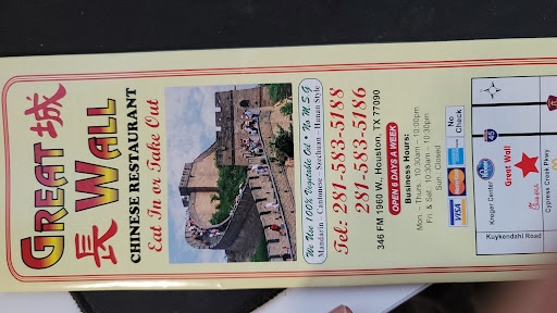 Read moreThr Great Wall is Covid friendly. They strongly suggest that you order ahead by phone, if its busy keep trying. If you order at the location, they have set it up where the menu is on the window and you order through plexy glass at the door and only one person can order at a time. I wish I would have taken a picture of the food. I got their version of the bourbon chicken. My thoughts of bourbon chicken that I have had was from the malls in America where its grilled chicken thighs in a sauce. This tasted like old chicken thighs and the sauce taste like sweet and sour SALT!!! It had a few pieces of broccoli in it and it came with fried rice. But I had to drain most of the sauce and let the rice absorb the rest of it, because it was so salty, full of soy sauce. The only reason I gave it two stars is because the egg rolls were great. But write your own story about the Great Wall Chinese Resturant and let us know...