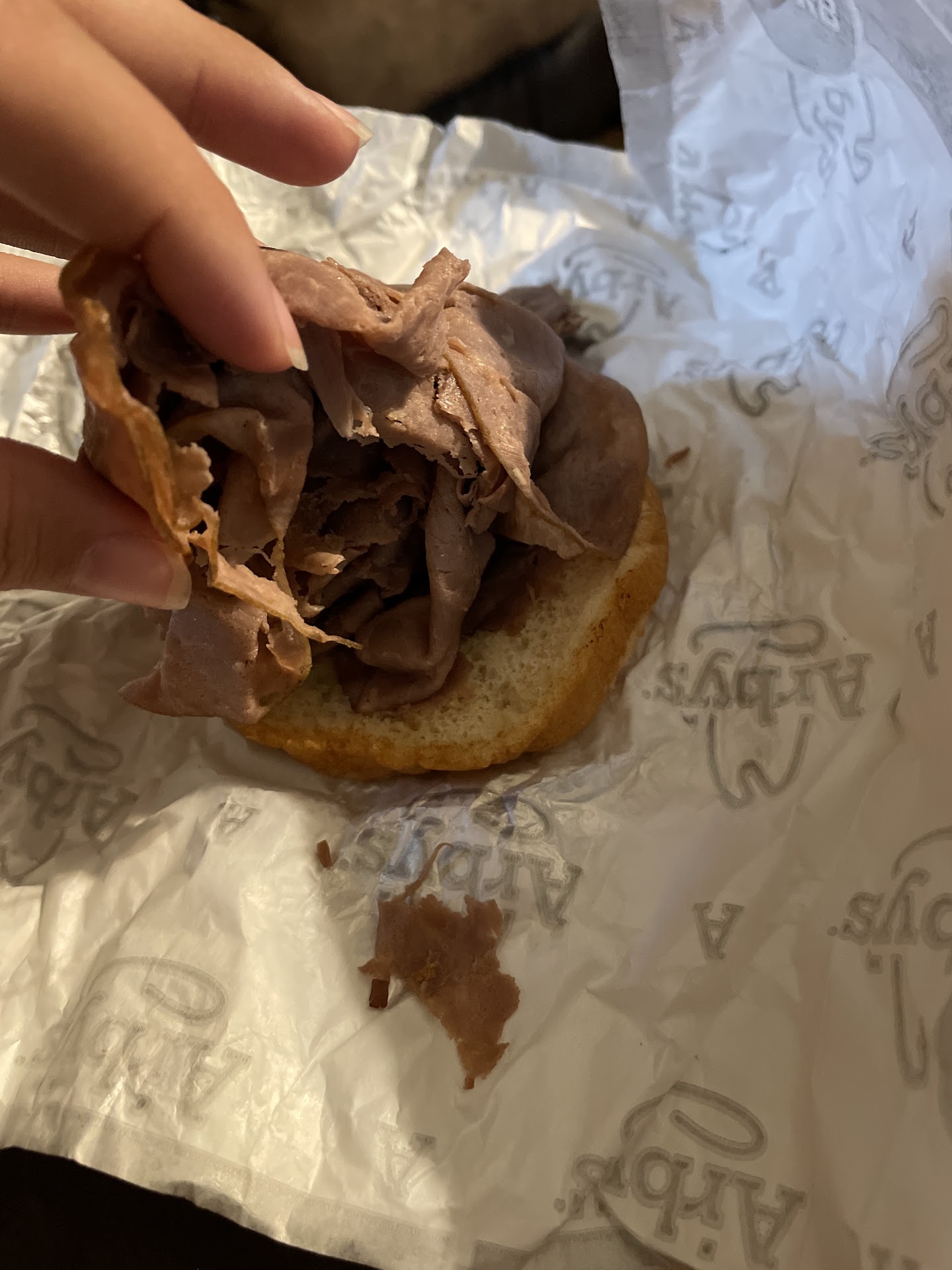 To make matters worse the bathrooms were completely disgusthing there were no paper towels and the hand dryer was not working. I hate to think this is the restroom employees are using and unable to properly wash their hands when they make our food. This arby's has really gone down hill since last visit. And to top it off the cashier didn't care, moved as slow as a snail and was on The Verge of rude. And I'd like to add there was hardly any beef on my sandwich it was just a joke and a complete waste of time and money. No sense complaining to them again because the employees make it a point to show how...