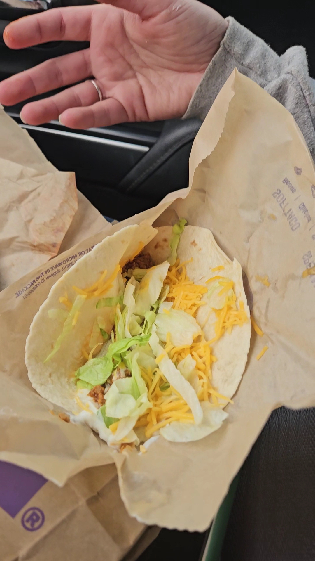 For some reason we did not have a big order but they really messed up our order we had three different things on our order and seems like they got them all mixed up we don't know why they were not busy and they're in a hurry for us to leave the dark through don't know why but we got three of the Dorito tacos that was supposed to be Supreme they were not I got the burrito and taco meal no beans no tomatoes add tomatoes everywhere Dorito tacos that was supposed to be supreme they were not I got the burrito and taco meal know beans are tomatoes at tomatoes everywhere and Harley any meat on the burrito I don't understand why my granddaughter got the XXL steak burrito and we got the deluxe fries barely had any fries in there and Bailey Howe leaning on them I was very surprised and upset so I guess I need to pick and choose the money I spent there we should have just went to eat at asset someplace else we just wanted something to take home be hot and it sounded so good my taco was completely broken in half all over the place so I kind of had a taco salad if that's what you want to call it after I picked all the tomatoes out we tried our best to eat what we could but it was...