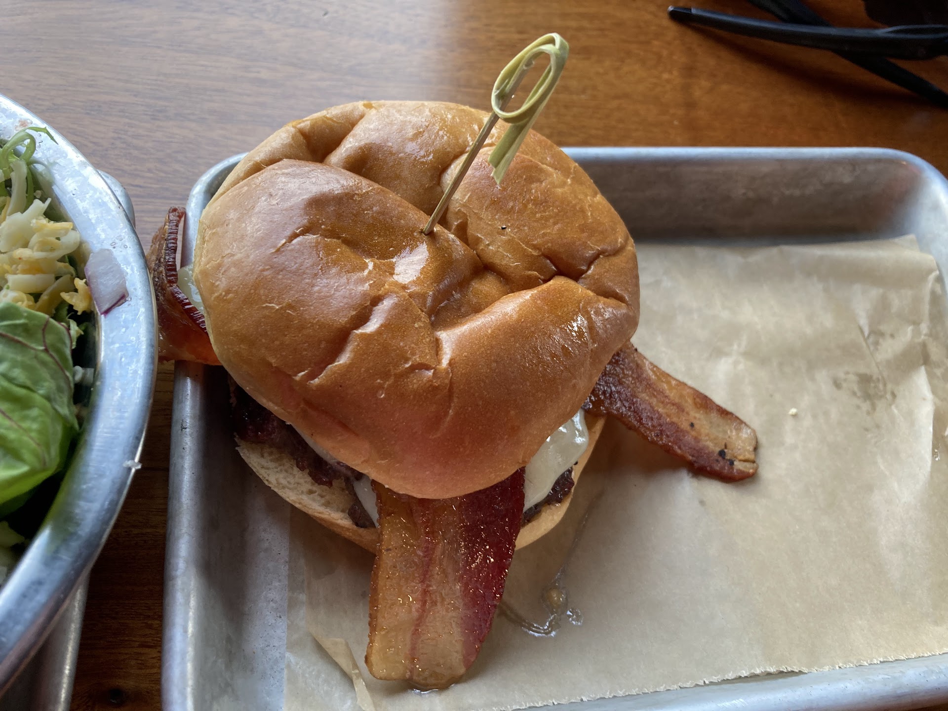 Companions one and five ordered the BBQ quesadilla. Both liked it but felt that the more you ate it the greasier it seemed to get. Companion five would have preferred to sub the extra grease for more BBQ sauce. Companion one also had a housemade ginger beer soda which was well received w/ a nice punch of ginger. Companion five had a side salad. Although it looked like it was served in a doggy bowl, it was a good size and your typical salad.