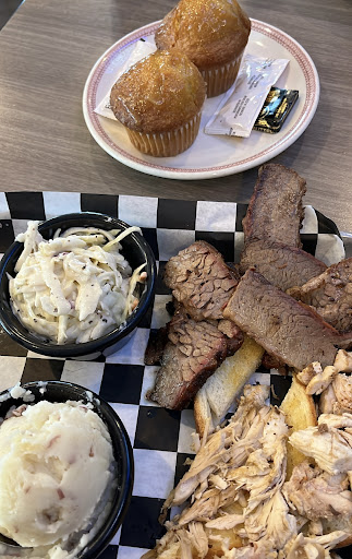 My husband ordered the two meat combo with brisket and pork. You get the choice of brisket, pork, smoked wings, smoked chicken--add grilled shrimp 6.99. It came with cornbread and two sides so he ordered the garlic mashed potatoes and french fries. He loved it all and mentioned how great the potatos were. He also has enough left over for lunch.