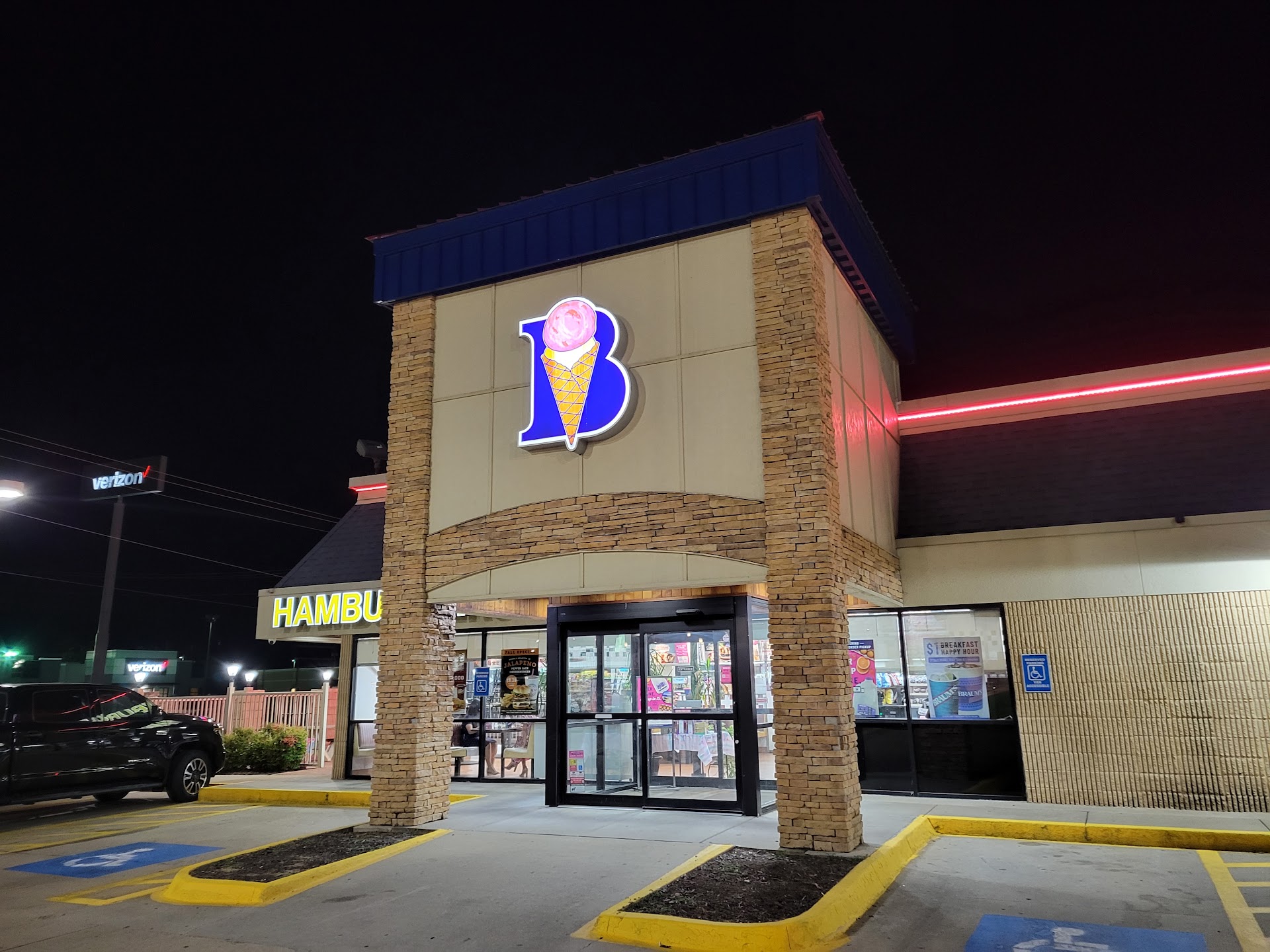 Everyone knows Braums from the giant neon ice-cream cone signs. Well they do have ice cream, including floats and shakes and malts, cones, you name it. They have their own brand of ice cream which you can buy by the scoop, like Baskin-Robbins, and they also sell their ice cream in tubs. We're talking a daunting array of flavors here. And yeah, it is really good.