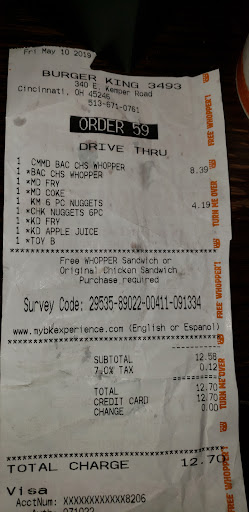 Last straw... done with this waste of space. don't get me wrong. i love the flame grilled burgers. the food is good. this establishment. not so much. starts with me ordering some chicken fires, fries and a coke. pull up to the window and everyone is wondering around looking wasted not knowing what the hell is going on... several seconds later they open the window "what did you order again?" so i repeated my order at the window... and was asked what sauce i wanted. i told them. what felt like an entreaty later i get my meal. i check to make sure its the right food, with how they where acting, it wouldn't of surprised me if they still screwed up my order... which they did! i get home and i have no sauce or straw for my drink after being told it was in the bag... at this point i normally vent my stress in just trying to get the asshats fired by giving a horrible survey. accept it wouldn't work... i get "code invalid" so i tried again... code invalid... i tired once more checking each and every letter.. yes they are 100% match. "sorry you have exceeded the survey limit" and nothing else will show on the...