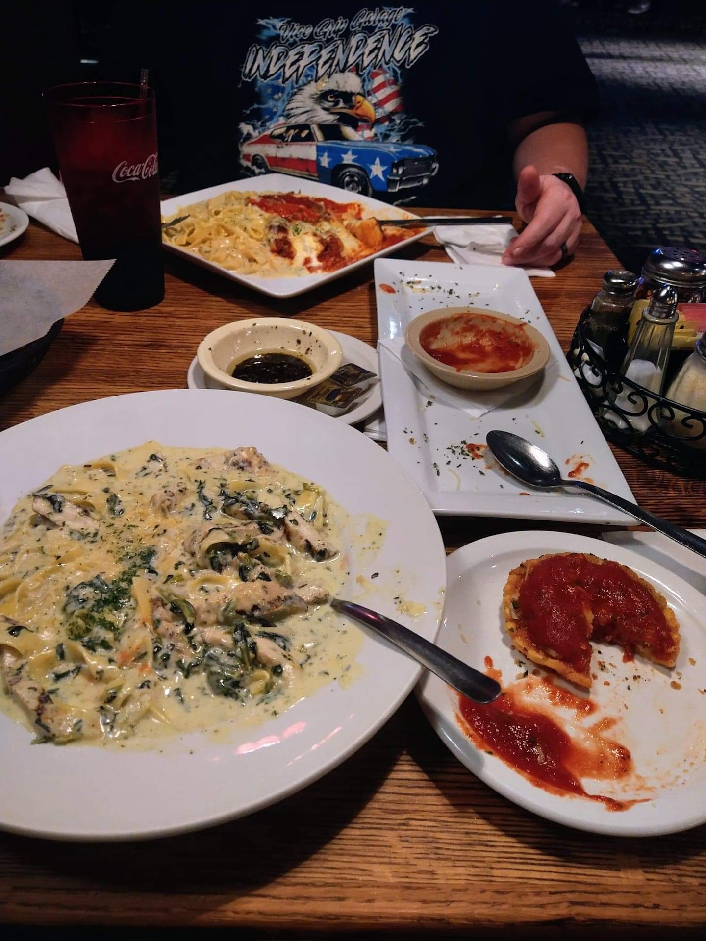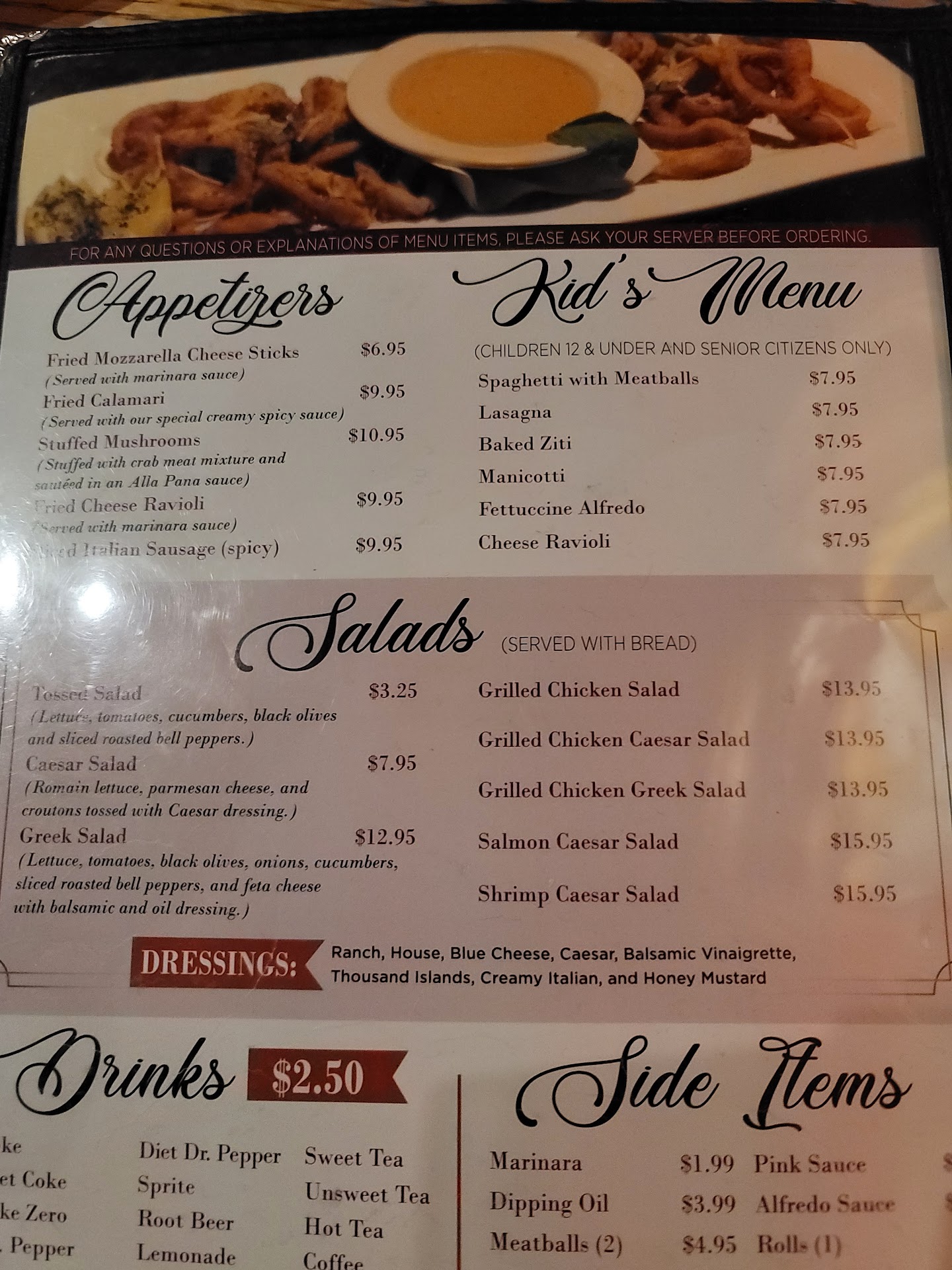 My wife ordered a chicken & spaghetti dish, well flavored, but the meal was soggy, sitting in water. Served dry and al dente this would have been great.
