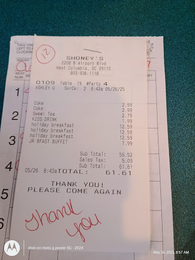 Read moreCame on a Tuesday morning around 10:00 a.m. This may have been my 3rd time eating Shoney's in my life. The other times were yearsss ago as a chap. I was craving some breakfast, but felt like I wanted a good variety to choose from. Before I even had a chance to order drinks or get to the buffet, a roach briskly ran across my table. 😭😭😭😭 I then watched it reach across the space between the table to the wall, and crawled up the wall and it sat there peeping the scene for a few minutes. I moved the table further from the wall and checked underneath and around....for more. Thankfully, there was none I could see. I watched it as it watched me. It came back down the wall, appearing as if it wanted to get back on my table. It didn't succeed. 🙌🏾 I truly honestly 100% wanted to leave so bad!! But unfortunately, I did not feel like dealing with a headache trying to bring it to someone's attention. By the way, my table was right next to the window, right next to the buffet. In my experience, service people in general, don't like complaints and if you have to complain, you may as well be the bad guy. I've learned to not complain to these restaurants around here, which is truly sad. Just to learn from my experience. I am sure this restaurant knows they have roaches. I cannot be the first and only person to ever see one there. This little guy was comfortable okay!! Felt like I was encroaching on his territory. The way it looked like he stretched that body to climb across the space from the table to wall with no effort. Like he does that on a regular. Employees of all people, have got to know that there are roaches. They spend alot of time there. I decided to just brush it off since I was hungry af and had a good day up until then. Normally, something like that would have had me furious. Thank God for growth. Then the grits and cheese had a funny taste, the eggs did too. The pancakes were dry and hard. The bacon was great. The fruit was great. The salad was great. The apple juice was great. I really cannot believe that I still ate what I could and I paid for it with a smile...but whatever. I will (maybe) try Shoney's again, but this time, a different location. I'm sure they all can't be the same....at...