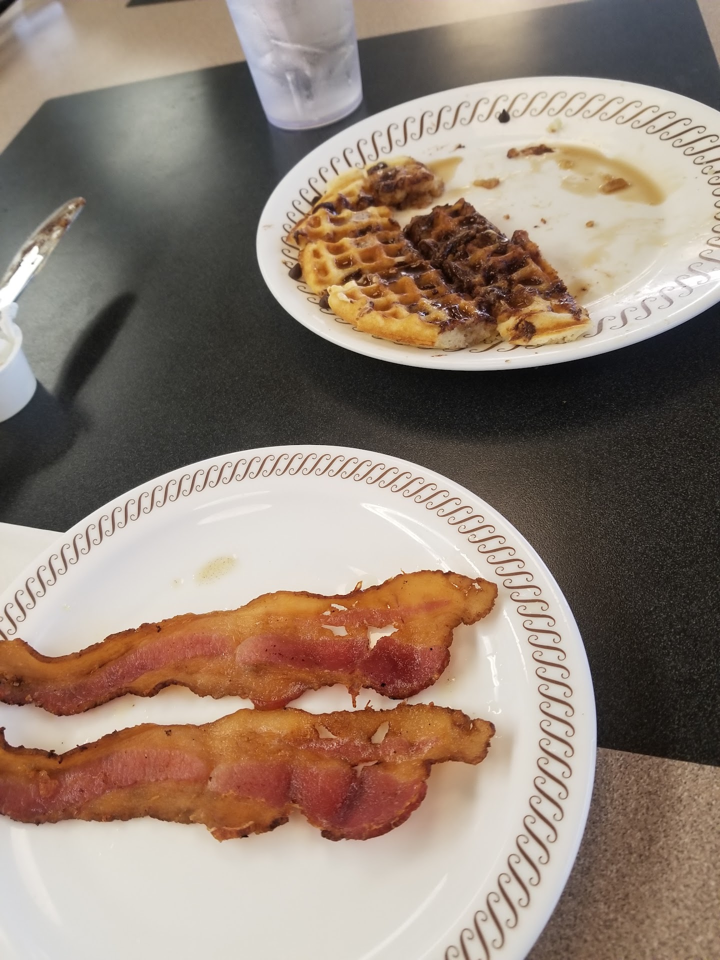 Read moreOur server was so sweet. She was pregnant and she just glowed! We talked about her upcoming 3rd son and how she and her husband met in middle school. She kept us served and made us fresh coffee. We were in there at midnight. Not our usual hours. My mom and I had taken my step dad to the ER and he'd been admitted. We were headed home and we were staving. We wanted coffee, but wanted half and half caffeine. She made us fresh decaf! The food however, wasn't very good! I got the super something special LOL the eggs were cooked fine the hash browns tasted like hash browns, however, the bacon was horrible and the wheat toast was just brown white bread that was the cheapest bread you could buy. It tasted awful. it had been in a toaster for a few minutes and gotten hot enough to melt some butter and then set aside while everything else was cooked. It was cold you could tell it had been toasted but it didn't feel or taste toasted. If you put jelly on it you could kind of get tricked into thinking it was toast. The waffle was good, good enough. It was average food and bad food. So if it wasn't for the waitress there's no way I would have given three stars. I wish I would remember her name because Springdale Waffle House, she deserves the raise! Tuesday night August the 28th, she worked until 2am on the 29. I'm sure you don't have very many pregnant women who work that shift LOL give her some praise...