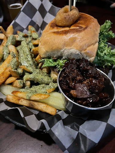 After doing The Narrows hike, we needed a good place to refuel. Went in and were told it would be a 30 minute wait- we were okay with that because there was seating outside available to wait. About 10 minutes later, buzzer went off and we were seated in a lovely booth with a view of the mountain face. The sun was going down and it was perfect, just perfect. Our server came quickly and greeted us with enthusiasm. She got our drink order (waters, a coke, unsweet tea, flight of 4 beers) and returned within about 5 minutes ready to take our order. We ordered two burgers and two chicken sandwiches, with 2 orders of the chimichurri fries. We sampled and discussed the beers while our food was prepared, each member of our party really liked at least one of the beers. My favorite was the HEF- fruity with a neat clove finish. My husband liked the Zion which he said was wheaty and smooth. The food arrived quickly (good thing because beer on an empty stomach 🤪) and oh my goodness! Such deliciousness! They didn’t put the onion rings on the burger but instead brought us a full basket, which were hot, fresh, and super delicious! The chimichurri fries were THE BEST we have ever had, garlicky and amazing! The burgers were perfect with a bacon jalapeño jam that gave just a hint of a kick. Bun was substantial and held up the burger and toppings well. The lettuce and tomato were so fresh and looked just like they do in the pictures - green, leafy, and crisp. First time I got “picture quality“ lettuce. Chicken breast sandwich were very good too. Service continued to be excellent with frequent stop bus to see if we needed anything and to refill waters. We plan to return to the area soon and will definitely be stopping...