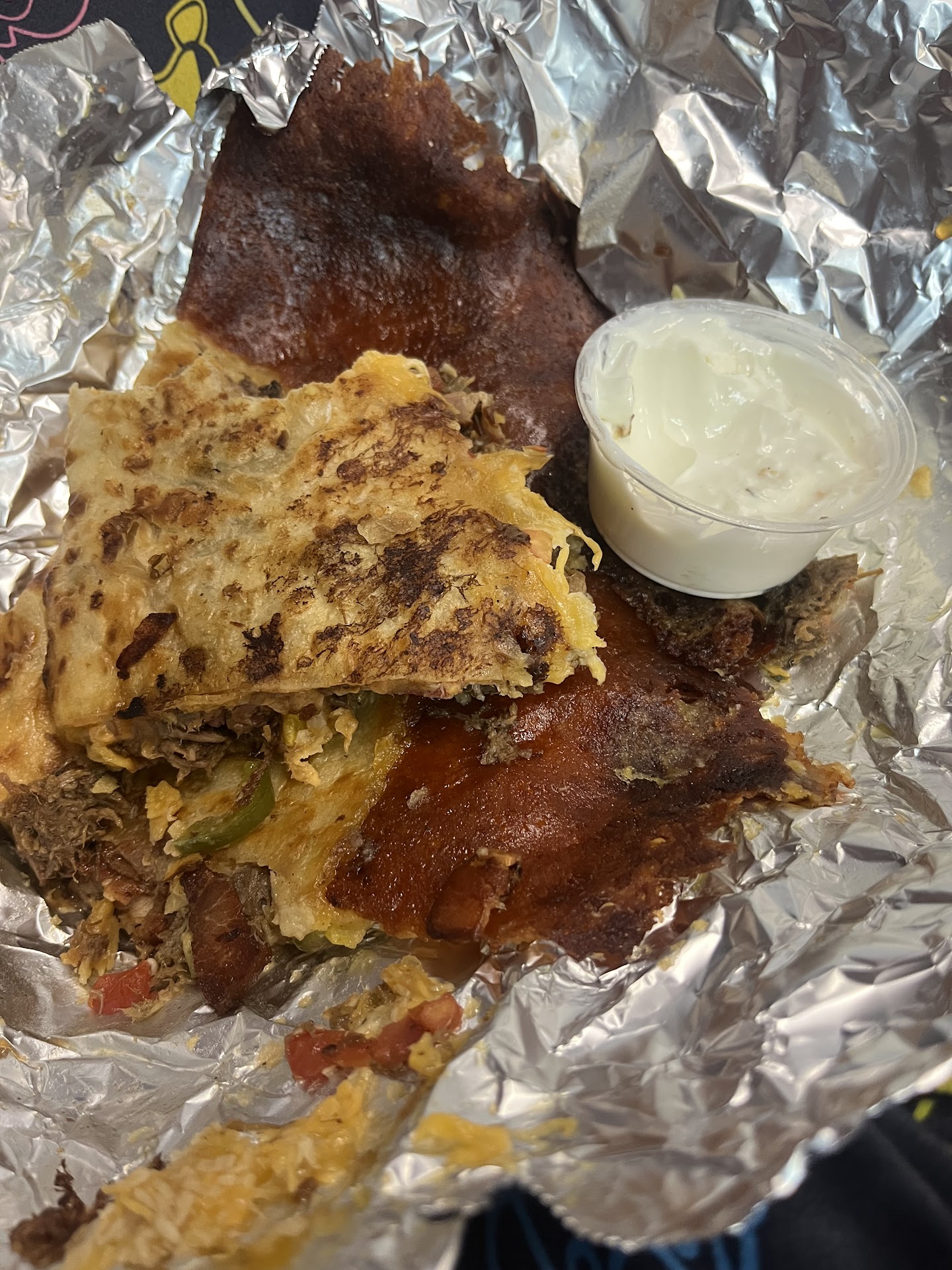Read moreI've included a picture of my bf's quesodilla, unfortunately I didn't take a picture of my taco salad - it looked bangin' & I didn't think I'd write a review. That means that this is one written out of dissatisfaction. My bf's "cheese beard" as he called it was kind of ridiculous, as was the amount of "extra meat" put in it (he told me this specifically). He DID order a lot of add ins though, so that might explain the cheese. As for my taco salad, I think there was one of the three sauces I had ordered; two were bbq & I didn't taste any bbq at all. I did taste something but I couldn't name what, it didn't taste like peach, part of the name of the third sauce I ordered it with, Peach Warrior. My bf got a burrito as well, but he won't be eating that for a bit. Maybe I can update later. As far as I know, they got his additions right, but I feel pretty disappointed & kinda regret adding on to the tip I initially gave them. I tipped a total of $10 for a like $60 check because my bf added on so many things to two items. Maybe I'm being selfish with this review, but that depends on how his burrito is, really.