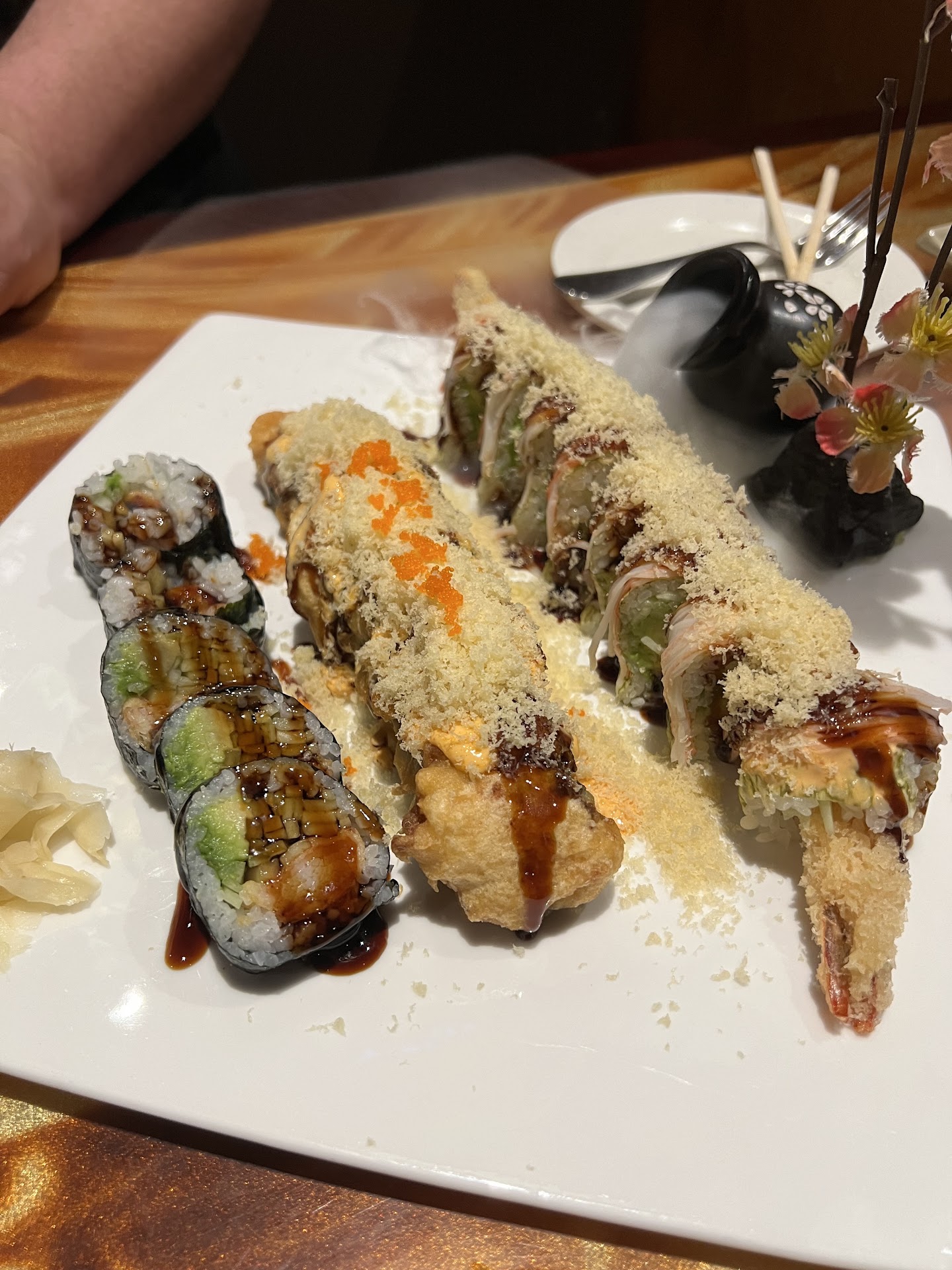 The shrimp lo mein was FULL of shrimp and was a HUGE portion for only around $10. That is a steal in this economy. The crab rangoons were good, with a thick sweet and sour sauce to go with them. All of the sushi was so fresh, made to order, and came BEAUTIFULLY plated. We were blown away. The plates had decorations with little vases and dry ice, in addition to botanical items. All of the rolls were incredible. The basic rolls are so reasonably priced, and the Ichiban roll was worth the splurge. That was our favorite one!