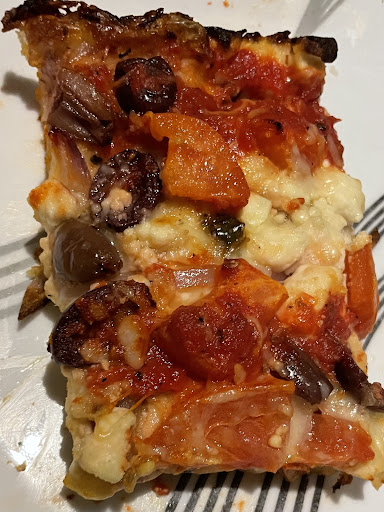 Greek Detroit Style Pizza: Next, I ventured into the Greek Detroit Style Pizza, which was nothing short of a culinary revelation. This pizza took the classic Detroit style and infused it with vibrant Mediterranean flavors. The crust maintained that same delightful crunch, but the addition of olive oil gave it an extra layer of richness.
