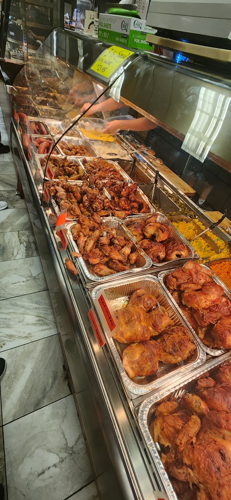 Everything was delicious! There was so much to select from. I chose to get a BBQ wing platter with 2 sides which were Mac and cheese and roasted potatoes. The mac and cheese was just ok but I didn't expect it to be so much, it wasn't as cheesy it just takes like noodles with creamy cheese sauce and very wet in texture, but it was edible but I probably wouldn't get it again. The roasted potatoes were very good, exactly how it sounds. I also picked, a kielbasa, which was very good. A smoked turkey leg, delicious and juicy. A side of green beans, just tasted steamed or boiled a bit with maybe butter in it but it was just ok in my opinion, I liked the texture not the flavor as it wasn't much to it, just basic green beans. I also, picked a side order of wings, which I received the bbq and the plain smoked wings and my family and I enjoyed them, they were cooked just right and very juicy and the BBQ wings had a good smoky BBQ taste. That I would try again. But yhe lady who served me was very nice, friendly and professional, she was very helpful and patient as I really was amazed with such a huge selection. Everything was hot and fresh and they also gave me a large quantity. It was enough for I bought but lasted for 2 nights dinner. I also, got their fresh homemade Lemonade in a half gallon, that was delicious as well! I will definitely be...