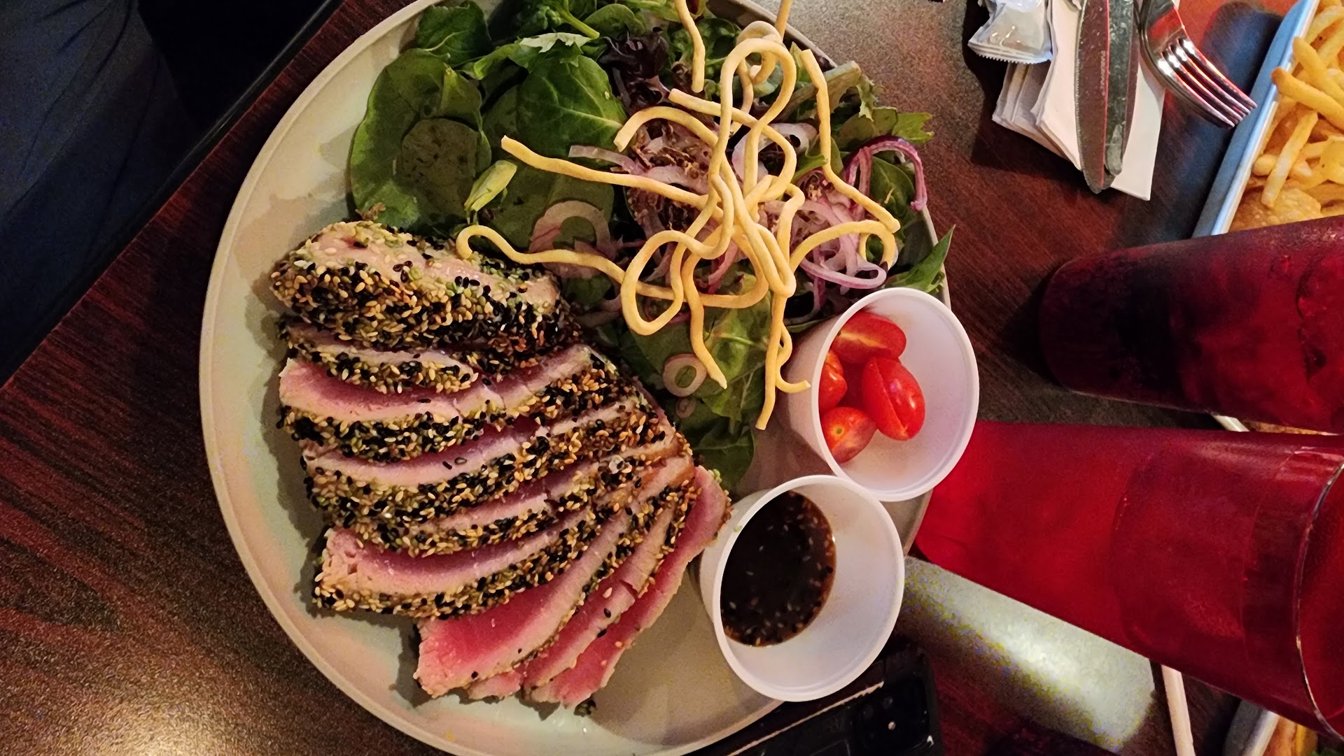 Read moreYou go through a bar to get to them order at a window the receipt automatically asks for tips above 25%. Salad which is a decent salad with greens onions tomatoes carrots is 15 dollar is a large salad but probably not more than 3.00 of material. The fish and chips, that's another story tons of fries shoe string fries with some type of curry salt but they were salted so so much they are like a salt lick. The fish is literally fish sticks 25 plus liquid death drink was a total of 44.00 i gave a 5 dollar tip because I think 50 dollars no service and pay ahead is not a 25% tip. Food is well overpriced. I dont normally give negative reviews but this one is definitely needed I hope the person in charge of looking at these takes this...