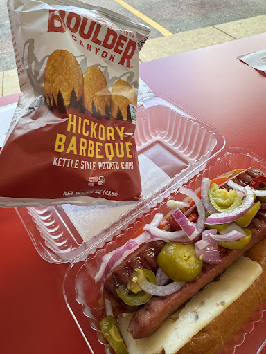 I wasn’t super hungry, so I decided to try one of the hot dog specials of the day—something called the “Chipoweenie” or close to it. It was a chipotle sauce–based hot dog with onions and peppers. I got the special with a bag of chips and a drink for about $10. The hot dog itself was standard fare, but the sauce and toppings made it outstanding and surprisingly filling.