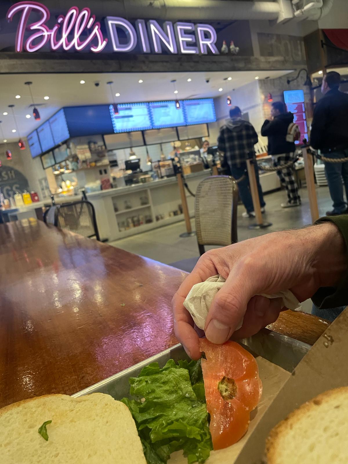The WORST burger I've ever eaten! We approached a woman to order two cheeseburgers, and she didn't remind us of the 50% off for people 50 and over. She was going to charge us $24.50. But we realized and, she was cranky and reluctant to have to change the order, as we needed to show our MGM cards plus Photo ID. The woman shouldn't work with the public. So, finally, we get our trays - the burger was WAY OVERCOOKED to the point of being so tough we could hardly bite into it! The roll was garbage, was not toasted and a fluffy mess that fell apart when we tried to eat the thing. The cheese wasn't even melted! French fries served with it were actually pale, limp and under cooked some even stuck together! Don't bother with Bill's. Try the Lobster Shack or anything else. Honestly, the worst cheeseburger...