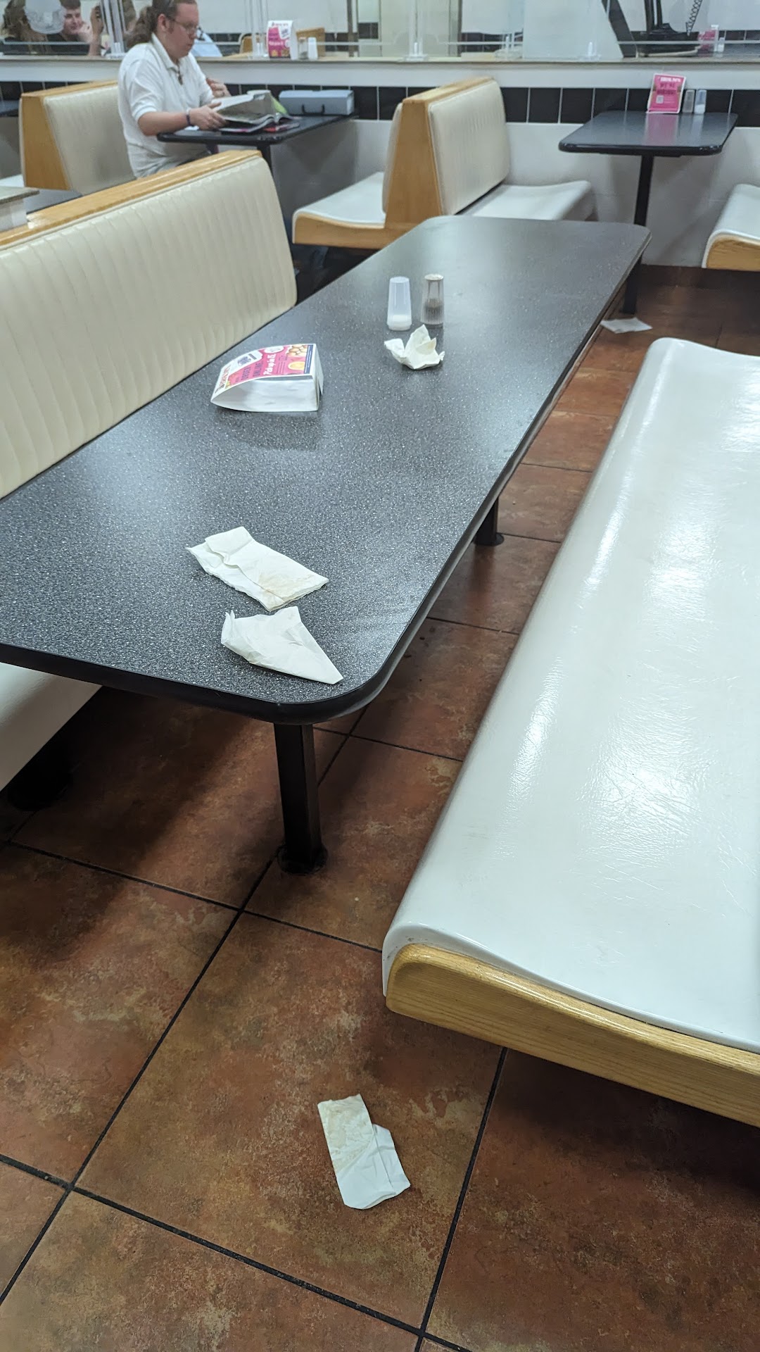 Walked in, the juveniles behind the counter yell hello to you, get to the counter and worker (short chunky female) signing off shift using foul language and showing off. Boy takes my order, acts uninterested, tables are a mess and pepper is mixed in the salt shakers at tables. Food lukewarm, small serving of fries that were not even close to lukewarm. The food is way overpriced. Finished eating and went to my vehicle to eat an overpriced tiny junior ice cream cone. Sat in my vehicle and could see straight in front doors. Could see workers running through restaurant since no customers inside. Looked like playtime in a nursery school. The place is overrun with kids working there and probably a kid playing manager. Not a pleasant dining experience. Get mature workers that will work, take their work seriously and not play around. Plus, why the expensive prices? Won't be back here anytime soon. Not the restaurant it...