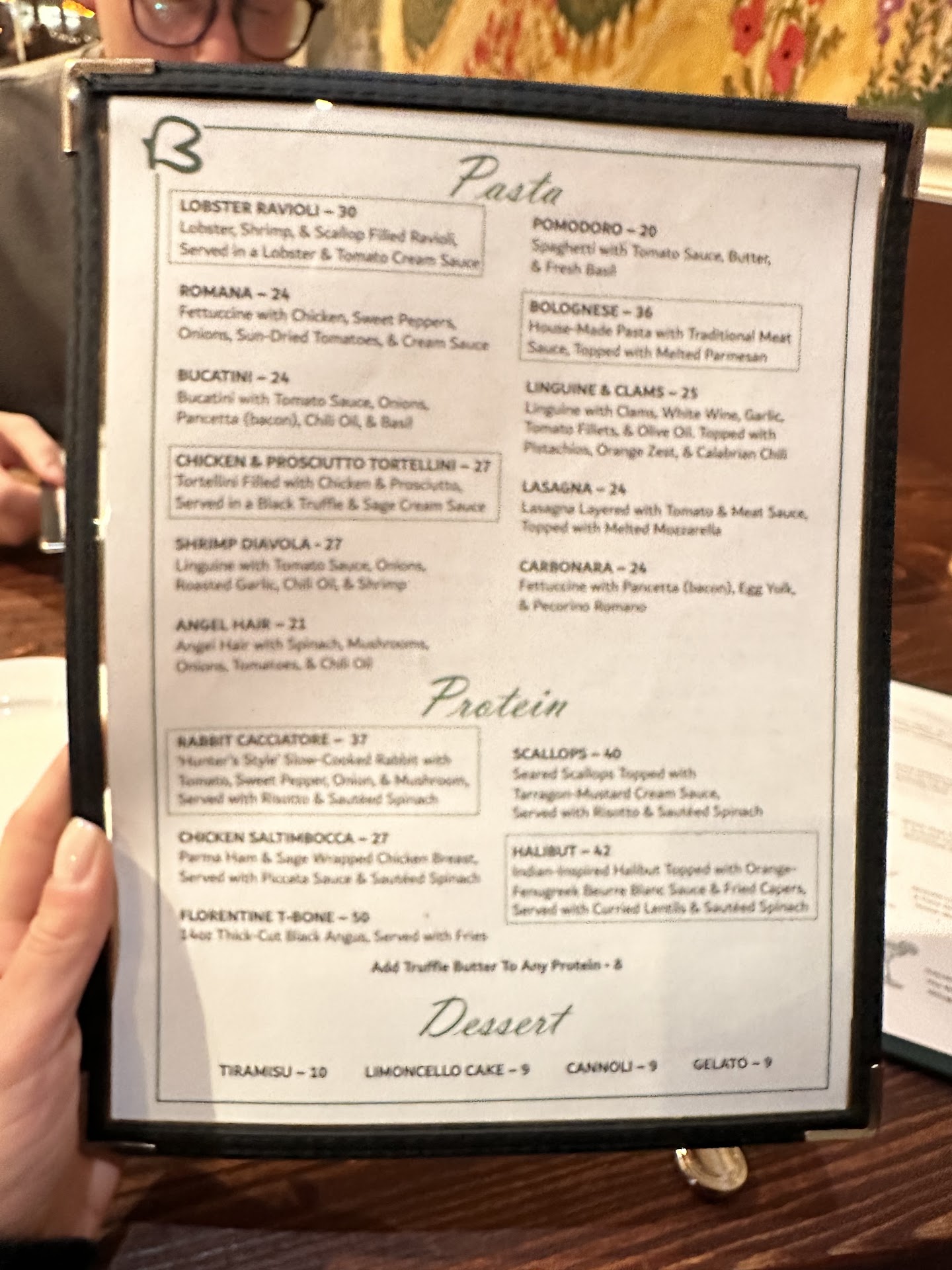 Read moreTheir authentic menu sets the stage for a wonderful Italian meal in the heart of downtown Springfield. We were eager to try this place after reading such glowing reviews, and we left exceptionally satisfied. As soon as we sat down, we were served focaccia with a blend of Italian olive oil and balsamic vinegar. We ordered two glasses of wine: a Chianti and a Chiarlo Barbera d'Asti. Since we wanted to try both the pasta and the pizza, we decided to share a margherita pizza as an appetizer. The pizza was amazing, with the perfect balance of dough and sauce. Their brick oven allows the pizza to be cooked authentically, as if we were in Italy, and adds an extra touch to the ambiance. With the pizza being so good, we expected no less of the pasta. My husband ordered the fettuccine alla Bolognese, and the ragù was so flavorful that he scooped up every bit and cleaned his plate with the last piece of focaccia! I ordered the daily special--penne with a white sauce (not Alfredo!), sun-dried tomatoes, and Parmigiano--which was absolutely delightful. The flavors blended perfectly. Although we were full, we saved room for dessert and ordered cannoli. The portion came with two, making it perfect for sharing. The way they whisk the ricotta gives it a delicate texture that tastes exceptional! Service was fast, and the staff was friendly and attentive. The location is great, right in the heart of downtown Springfield, so we could easily walk back to our hotel. Overall, it was an absolutely fantastic experience--a must-visit if you're in Springfield and craving authentic...