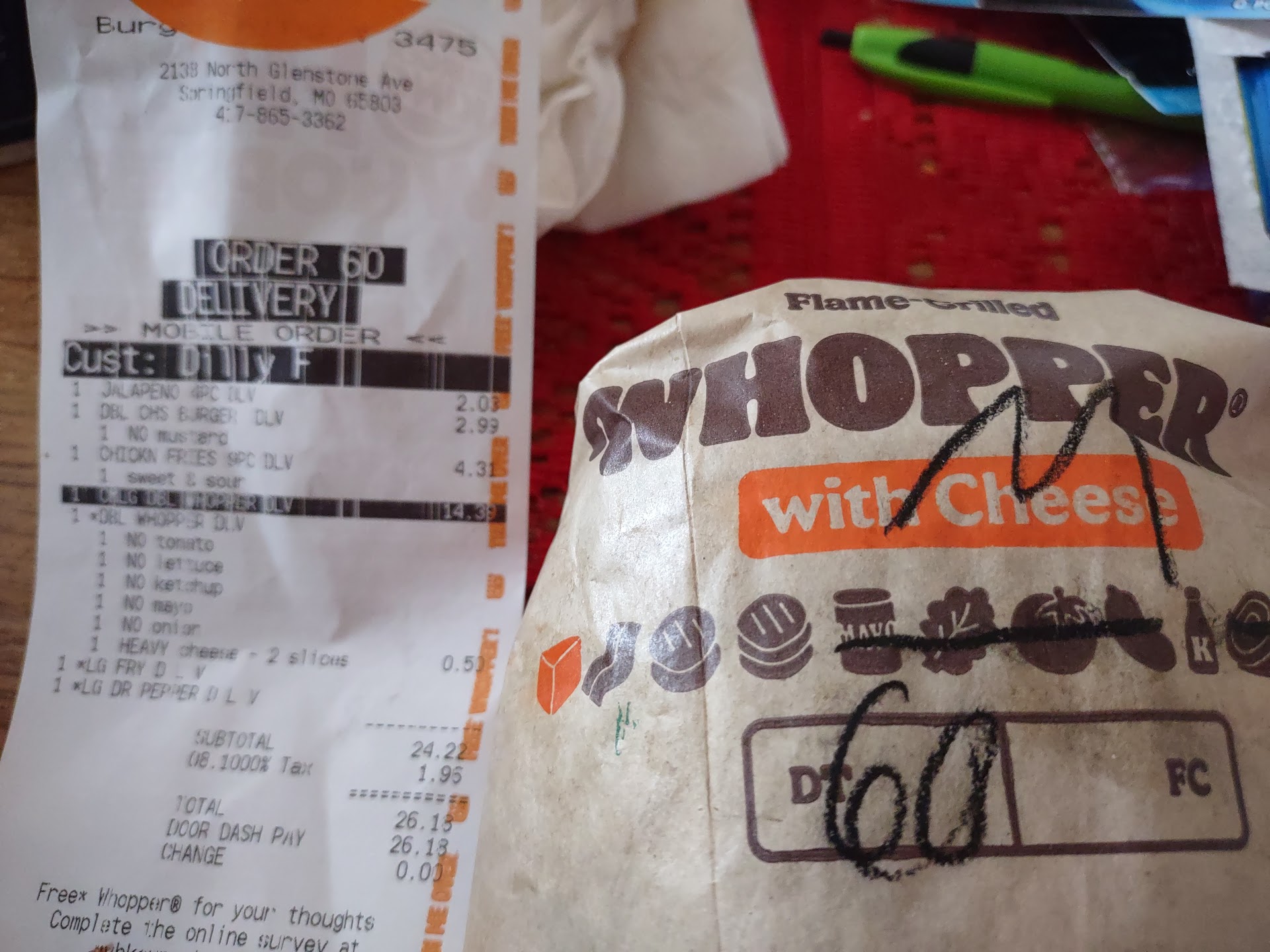 I went to this one bc one closest to me didn't have sourdough bread. I order the deal from online (buy one of their new chicken 🐔 sandwiches get whopper 🍔 free) I did it on my app and my husband's bc he wanted 2 sandwiches 😘 so I ordered mine with extra ok lettuce 🥬 EXTRA EXTRA EXTRA onion🧅 and no tomato 🍅 . I get food take home, OH LOW AND BEHOLD mine are wrong. So I drove ALL way back to get it changed. He said he would fix it "but like they have been doing since start of covid-19 and not taking or touching the messed up order" first I tried to give anyways bc A: I'm not going to eat it B: I always still try to give messed up back so can see they did mess up The first guy wouldn't, I said "Well my dog 🐶 will be happy" Then the (manager??) Comes to window and says give him the bag he wants to check 😶🤔🤨 so I gave to him and he checks, see's they did INDEED messed up. Goes to re-make it. I think he was one made it and didn't want to hear HE messed up. I get order and pull up and over to park and check AND IT WAS STILL WRONG!!!!!😔🙄🤬🤬 They were closed when order after my second mess up. Still try to call bc they have to clean up before leaving, but would NOT answer. I went home infuriated. I didn't eat I just gave to my dog. I normally don't have a big issue with them. I want to know that managers name and bring this to light. I mean they said would replace the next day...