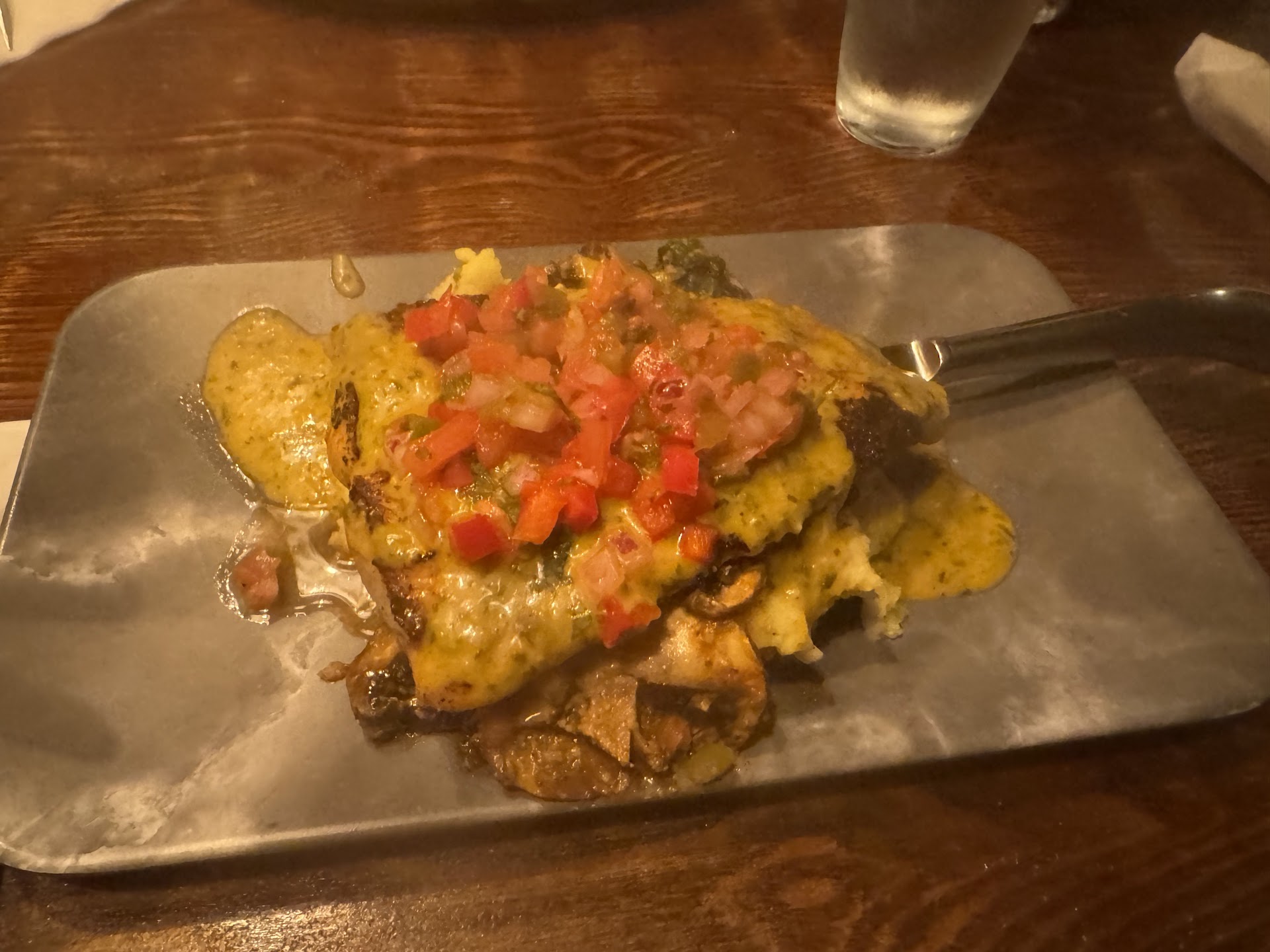 Blackfish Blackened Cobia over bed of yellow pepper mashed potatoes, grilled portobella and spinach drizzled with red pepper mojo and pico de gallo This was arguably the best dish of the night. Watched the cooks make fresh mashed potatoes for this plate. Tender perfectly cooked fish. Spicy 🌶️ but not over spicy . The portobello mushrooms to die for and just enough sauce for entire meal .