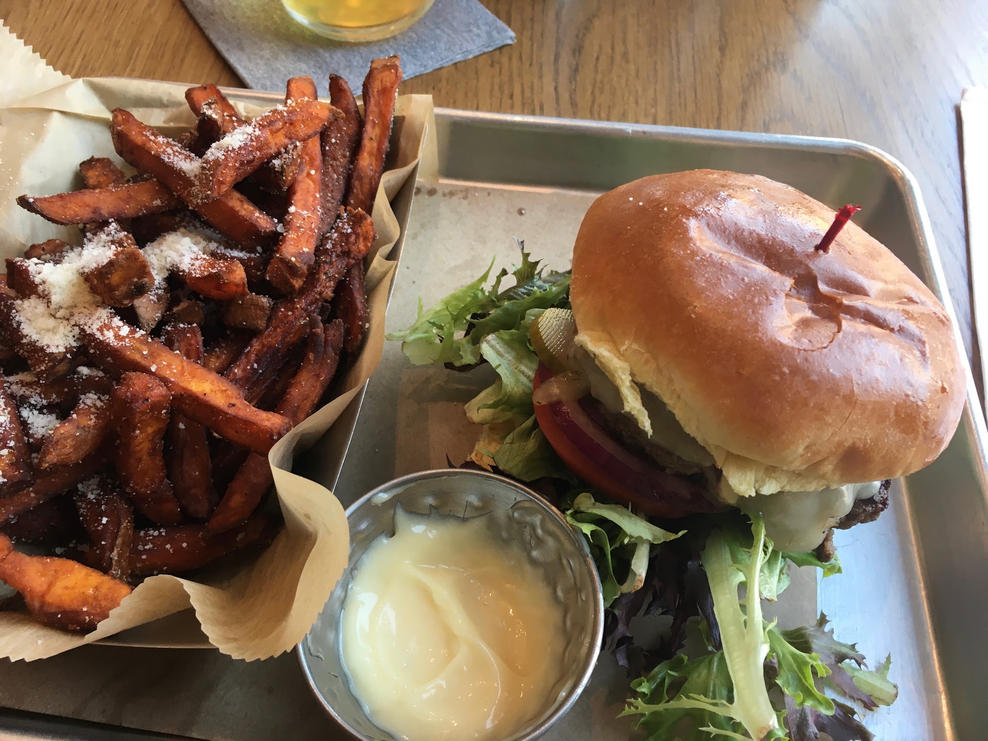 Craving a burger and staying the course. I went to the burger. It's called the The Local Burger! It is fantastic. No exclamation point needed. The burger is the exclamation point. The bun, stellar. The burger, stellar. Crisp lettuce! Cooked to perfection! Very tasty! Crushed it! I accompanied the burger with sweet potato fries! Nicely done! There was a dusting of grated parm, which really brings it to the next level! Washed it down with a Mother Stewart's Witt Beer! Which was nice pairing. Recommend doing that.
