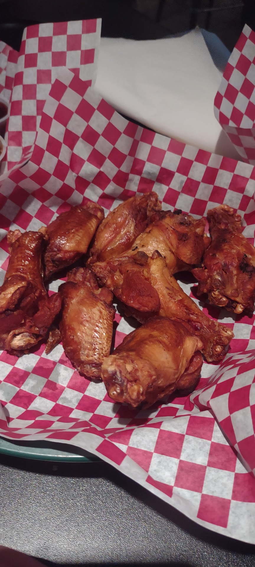 The food here was very good! We got the smoked wings with sauce on the side, and these may be some of the best wings I've ever had! If your into a lot of different sauces and flavors, you may be disappointed as they only had teriyaki, BBQ, Buffalo, Ranch, and Blue cheese. But if you are into wings at all, you gotta try this place. French fries tasted freshly hand cut and fried to perfection! And the falafel plate. Good falafel is hard to find, they make theirs fresh in house and it's very well done, ate a couple before I got the picture off. Food and service did not disappoint at all. Inside of the bar is low lit (to be expected), it was a little cramped inside, and the booth meeting is terrible. I sat in the booth and the springs were almost non existent and the beam beneath the spring was sitting in my crack the entire time. I don't know if every booth is that way, but if I went and hi tops were full with only booths left, I would find a different place to sit and eat.