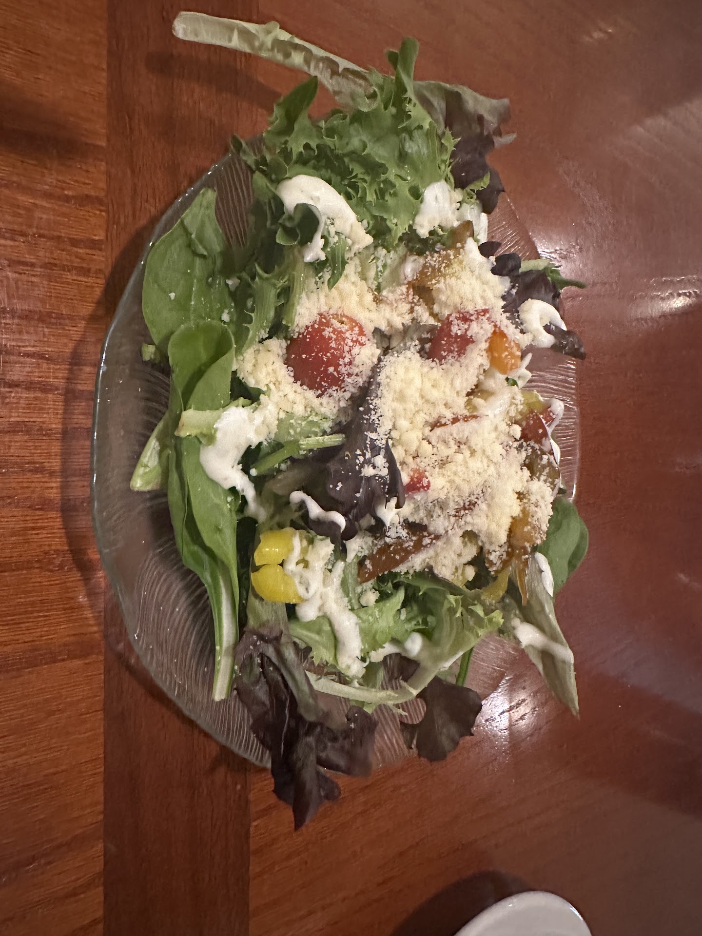 This restaurant’s staff (front & kitchen) are in dire need of training. We went early evening 30 May 25. We waited 10 minutes at the desk while the host was talking with a table of customers who had finished their main course. He saw us waiting as did the customers whom he was talking to. When he finally finished he came up to the desk and said just a minute and went to the register to help a waitress that was also waiting for him. This took almost 5 minutes. When he did come back he sat us immediately at a just cleaned table with silverware / napkins & menus only. The waiter came & took out drink orders and seemed confused about the sparkling water request that was clearly on the menu as he brought out 2 things I didn’t request so I said to just bring a plain glass of water at which point he came with what I asked for in the first place. The salads were brought out without bread and still no side plates. The meals came out in a reasonable time. My wife’s chicken dish was way over salted. I had the veal parm. I couldn’t see the veal for the sauce & mozzarella? cheese. The spaghetti was lying in water and the sauce was much to sweet (desert maybe?). The meat appeared to be frozen patties that could have been anything that was breaded and deep fried. The single slice of garlic toast I received with my main dish was so greasy that I couldn’t pick it up without needing to wipe my hand after putting it down. During the course of our meal we noticed other customers coming in and waiting as we did but the the the older couple that came in and the lady was using a walker were left standing for 15 minutes before they were addressed clearly shows how untrained & understaffed this restaurant really is. It’s a shame that this lovely venue does not have the staff to...