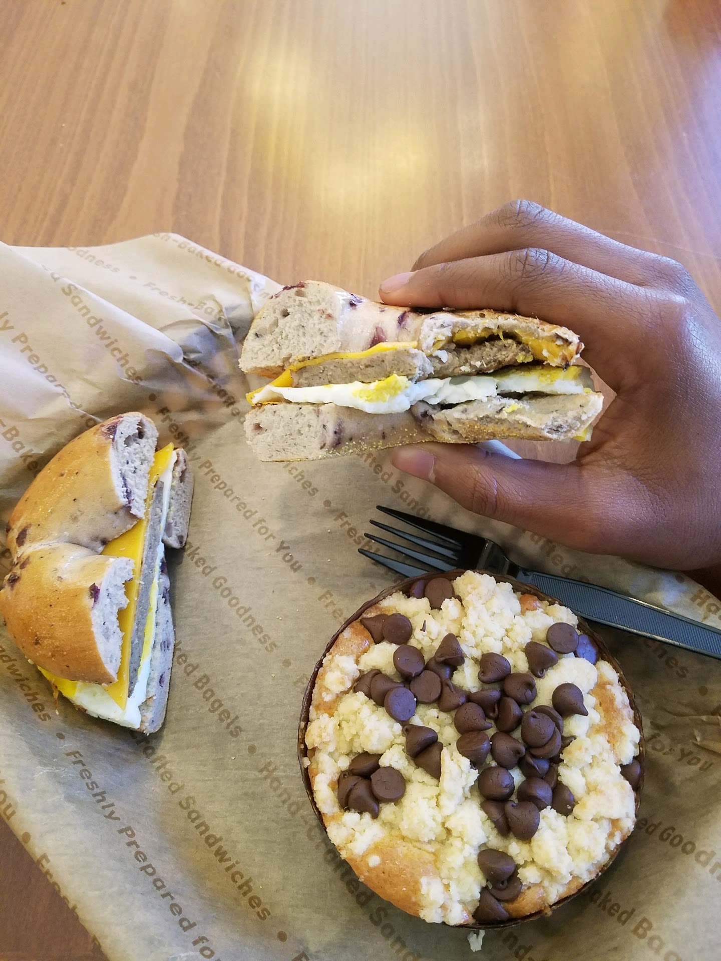 Her frustrated coworker eventually came up front with my two bagels with toppers. It was obviously made in a hurry, no thanks to window cashier. Cold bagels sliced at 80/20 with a flattened glob of Spicy Devil with barely any bacon or jalapeƱos.